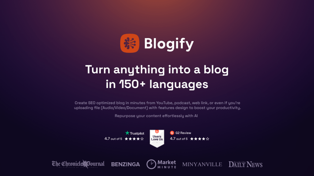 Blogify is an AI-powered platform that transforms different types of media into SEO-optimized blog posts. Whether you have videos, audios, podcasts, PDFs, or docs, Blogify can convert them into engaging written content effortlessly. This feature is invaluable for repurposing existing assets and reaching a wider audience.