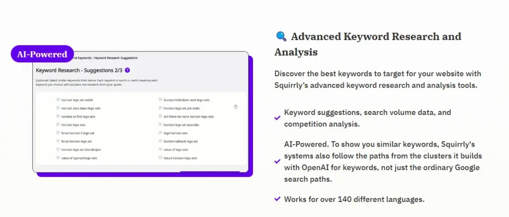 But it doesn’t stop there—Squirrly also provides in-depth insights for each keyword, including search volume, competition data, and relevance to your target audience. This means you won’t just get random keywords; you’ll be guided toward the ones that have the highest potential for driving traffic to your site.