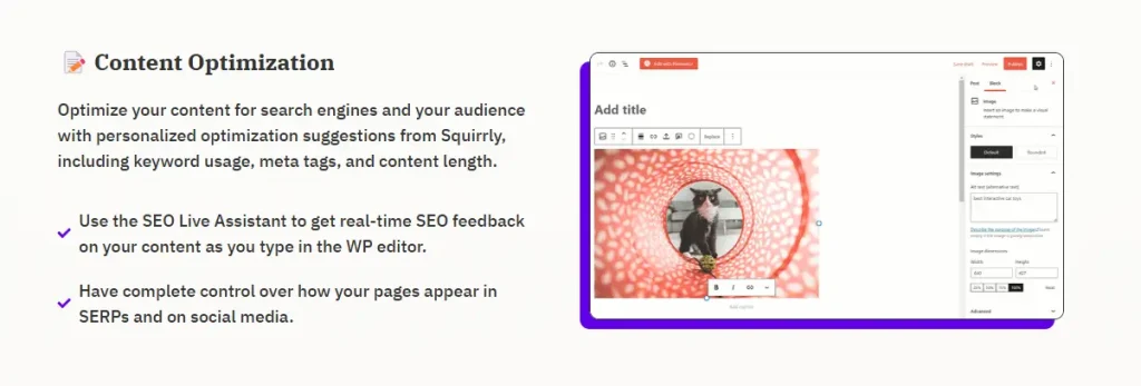 Finding the best keywords is only half the battle. The real challenge lies in implementing them correctly within your content. With Squirrly SEO, you’ll receive real-time feedback as you type in the WordPress editor. This means no more guessing if you’re using keywords properly—Squirrly will show you exactly where and how to optimize your content for maximum SEO effectiveness.