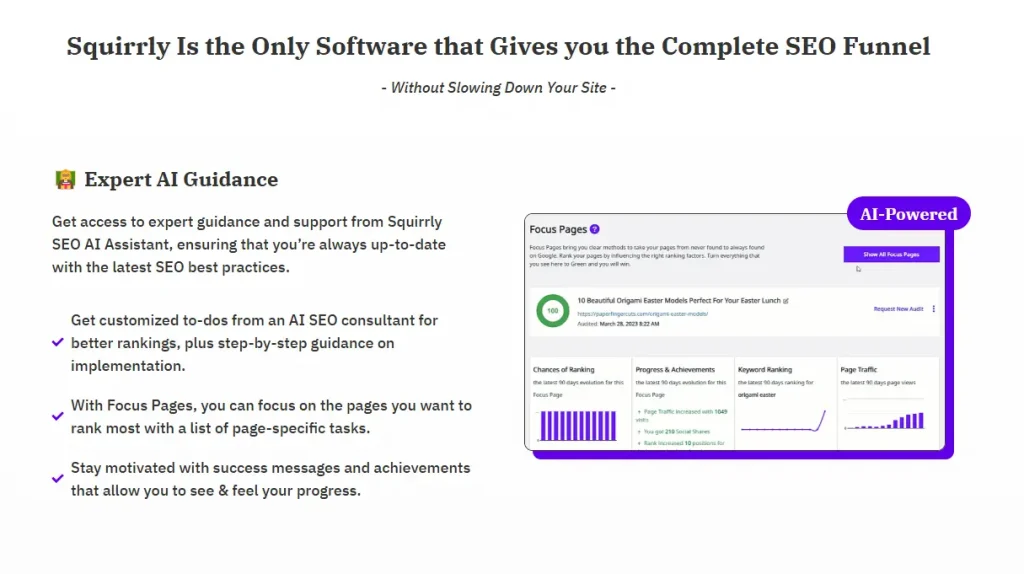 Whether you’re optimizing a blog post or an entire website, Squirrly’s AI consultant gives you a personalized SEO strategy, ensuring that your efforts are focused on the tasks that will have the most impact on your rankings. You’ll know exactly what actions to take to improve your site’s performance and which areas to prioritize. Gone are the days of guessing which SEO strategies will work best.